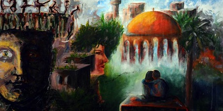 A big mural depicts the Dome of the Rock, the occupied al-Quds city [Jerusalem], Palestinian woman and her sacrifices for the homeland has been featured in an exhibition held in Damascus under the title ‘on the road to al-Quds’.