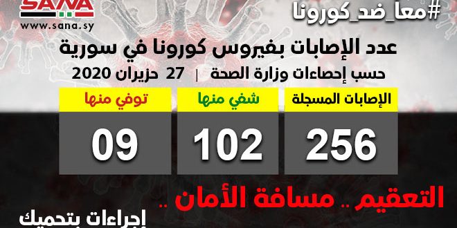 The number of confirmed coronavirus cases in Syria has reached 256 of which 102 have recovered and 9 nine have died, the ministry added.