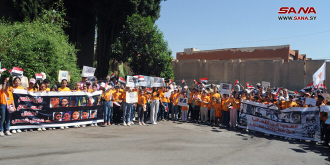 Damascus –(ST)- A number of Syrian children held a protest on Wednesday in front of the United Nations headquarters in Damascus, denouncing the brutal massacre committed by the Israeli occupation entity against the children and residents of the town of Majdal Shams in the occupied Syrian Golan.