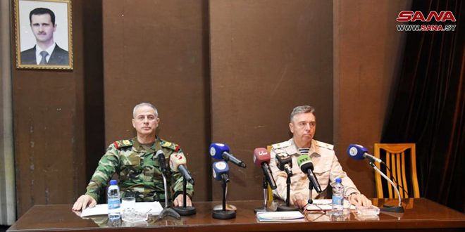 In a joint Syrian-Russian press conference to shed light on the terrorist attack that targeted the Military Academy in Homs, Major General Suleiman announced that the joint Syrian-Russian operations led to the destruction of all targeted terrorist sites and headquarters, including ammunition and equipment depots, and the elimination of hundreds of terrorists affiliated with the so-called “Hay’at Tahrir Al-Sham” (Al-Nusra Front), the Turkestan Islamic Party, and other terrorist organizations.