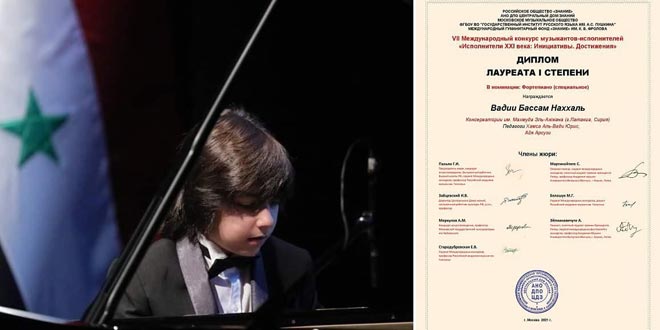 Young SyrianWade’e Nahhal, who boasts of an exceptional musical talent, won the first place in the seventh international competition for young composers “Twenty-first Century Performance .. Initiatives … Achievements” in Moscow.