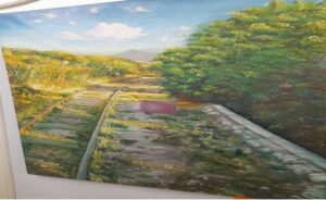 Rama teaches students how to paint with oil colors . She participated with a painting that depicted nature and a travel train.