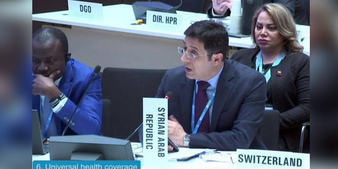 In Syria’s statement on comprehensive health coverage, the Minister of Health Hassan Al-Ghabbash called for working within the mandate of the World Health Organization to lift the unjust measures that negatively affect the health of the Syrian citizen. He also called for supporting Syria within the organization’s comprehensive health coverage plan to reach this goal.