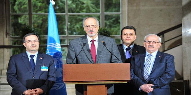 GENEVA, (ST)- Head of the Syrian Arab Republic’s delegation to the Intra-Syrian dialogue Bashar Al-Jaafari has stressed that the threats made by some members of the “Riyadh opposition” group before leaving Geneva were embodied in terrorist attacks against civilians in Aleppo and in al-Sayeda Zeinab neighborhood in Damascus countryside.