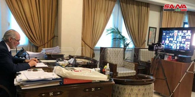 Al-Jaafari’s remarks were made during a speech he made via video during the International Arab Forum for Lifting the siege and sanctions being imposed on Syria .