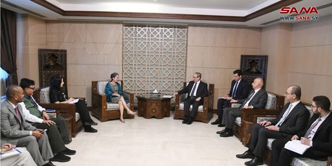 Damascus, (ST) – Minister of Foreign Affairs and Expatriates Faisal Al-Mikdad on Monday met with the Assistant Secretary-General of the United Nations and the Director of the Crisis Burerau of the United Nations Development program Shoko Noda and the accompanying delegation.