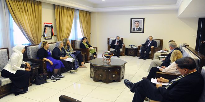 Deputy Minister of Foreign Affairs and Expatriates Fayssal al-Mikdad met members of the US Peace Council delegation and briefed them on the situation in Syria and the terrorist war waged against it with a direct support by some Western countries and states in the region, affirming the need to convey the true image of what is happening in Syria to the US people, according to the State News Agency SANA.