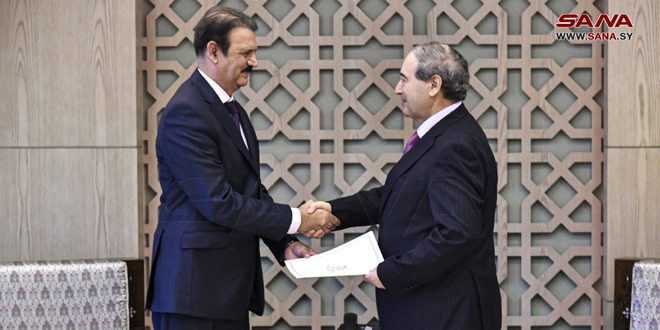 Al-Miqdad receives a copy of the credentials of Shahid Akhtar, Ambassador Extraordinary and Plenipotentiary of the Republic of Pakistan to Syria