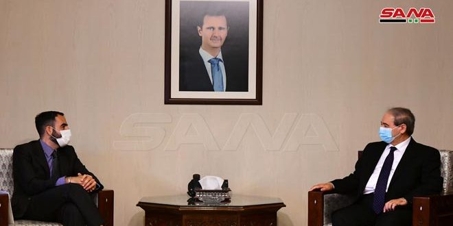 DAMASCUS, (ST)_Minister of Foreign Affairs and Expatriates Faisal Al-Miqdad received on Thursday a copy of the credentials of Ambassador Extraordinary and Plenipotentiary of the Republic of Argentina to Syria Sebastian Zavala.