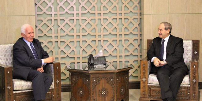 During his meeting today with member of the Executive Committee of the Palestine Liberation Organization Azzam Al-Ahmad and the accompanying delegation, Minister Al-Miqdad said that the Palestinian issue will remain the central issue of Syria and that Syria will continue to support the Palestinian people, their firm and inalienable right to self-determination, the establishment of their independent state on Palestine’s national soil with Al-Quds as its capital. He also stressed Syria’s support for granting Palestine full membership in the United Nations, guaranteeing the right of refugees to return to their homeland, in accordance with General Assembly Resolution 194 of 1948.