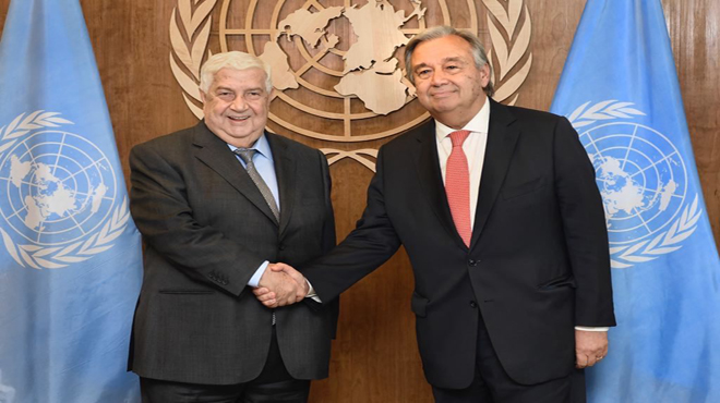 NEW YORK – Minister of Foreign Affairs and Expatriates Walid al-Moallem on Friday met UN Secretary-General António Guterres on the sideline of the UN General Assembly meetings, briefing him on developments in Syria.