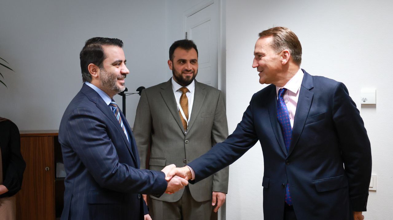 Foreign minister Asaad Al-Shaibani meets with Maryam Al-Misnad , state minister for international cooperation at the Qatari Ministry of foreign affairs, and the Polish Foreign Minister Radoslaw Sikorski on the sidelines of the Brussels Donor Conference on Syria.