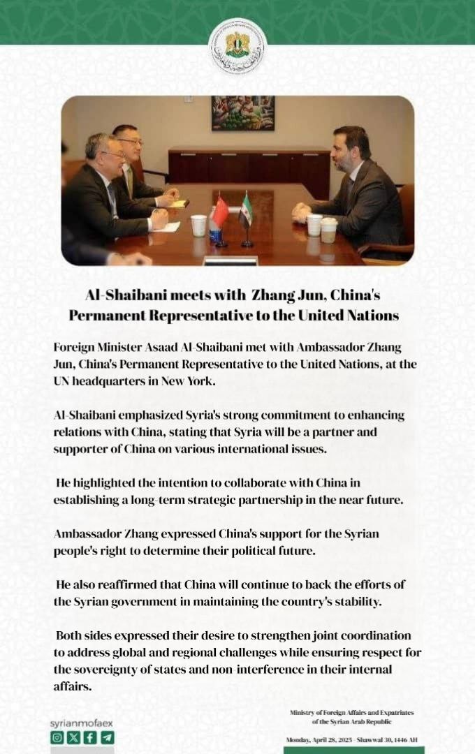 Foreign Minister Asaad Al-Shaibani met with Ambassador Zhang Jun, China’s Permanent Representative to the United Nations, at the UN headquarters in New York.