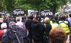 Protesters calling for an end to the crisis in Syria have demonstrated outside the US embassy in London. The Stop the War coalition, said the gathering was also an attempt to raise concerns about American plans to arm ‘rebels” in Syria.