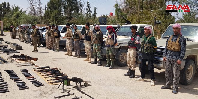 In a statement to SANA, leader of the armed group Ghannam Samir al-Khudeir, known as Abu Hamza, said that he and his fellow militants had been displaced by Daesh terror organization from an area in the east of Sweidaa province to Daraa from where they entered Jordan in coordination with leader of the so-called “Ahrar al-Ashayer” group. “There, we received a month-long training and then we were sent to al-Rukban camp where we discovered that most of the weapons and relief aid and supplies were being sold to Daesh, and after joining “Jaysh Maghawir al-Thawra” we discovered that this group also supports Daesh, thus, we lost confidence in all the groups and decided to turn ourselves in to the Syrian Army.”