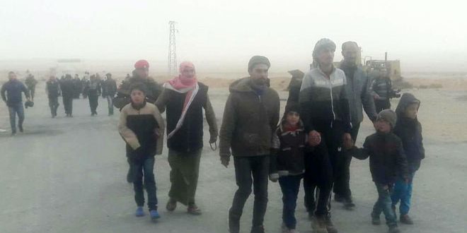 SANA reporter in Homs said that 10 families consisting of 70 members returned today to their houses in al-Qaryaten in Homs eastern countryside from al-Rukban camp near the Syrian-Jordanian borders with the help of and under the protection of units of the Syrian army. Most of the returnees were women and children.
