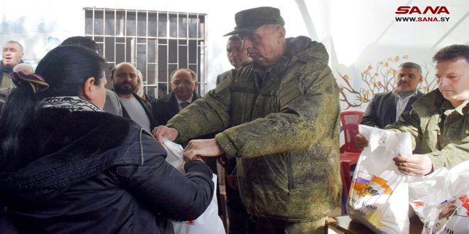The head of the Russian Center for Reconciliation in Damascus and the Southern Region, Rear Admiral Vadim Collet, said in a speech: We coordinated with the Quneitra Governorate to visit Homs and provide some aid to the families of the martyrs and the wounded, especially in these difficult circumstances. He added: We, the Russian military, are present on Syrian territory to stand with our Syrian brothers in their war on terrorism, hoping for a speedy return of peace to the Syrian land.