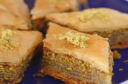 Baklawa is a popular dessert in Syria, made by using nuts and sugar syrup wrapped in Filo. A ‘filo’ is a thin sheet of un-raised dough that is used in various desserts.