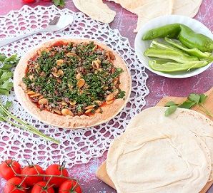 5- Spread the Mutabal in a plate. Spoon over the meat sauce and sprinkle the pine nuts and chopped parsley.