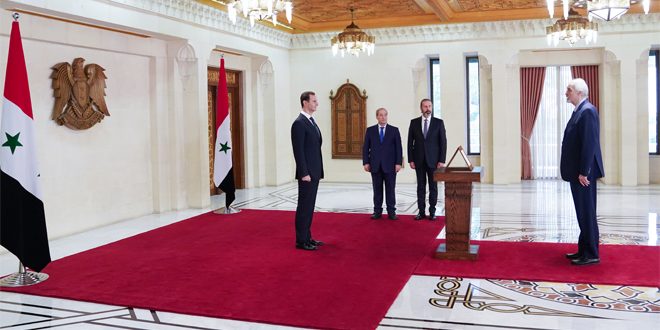 The swearing-in ceremony was attended by Dr. Faisal Miqdad, Minister of Foreign Affairs and Expatriates, and Mansour Azzam, Minister of Presidential Affairs.