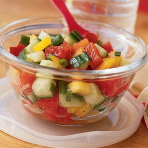 - Combine first 5 ingredients in a large bowl. Combine lemon juice and next 5 ingredients (lemon juice through garlic) in a small bowl; stir well with a whisk. Pour dressing over vegetables; toss gently to coat. Serve salad on lettuce leaves, if desired.
