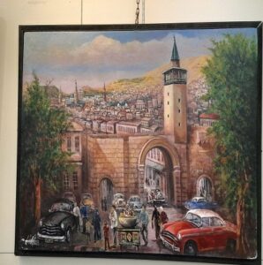 Alaa Al-Ghabra is a young artist who participated with three paintings about Damascus, the first one depicts the Umayyad mosque, and the old damascene house, the second painting shows  the minaret of the mosque with Qasioun Mount, and the third painting is a snapshot of old Damascus.