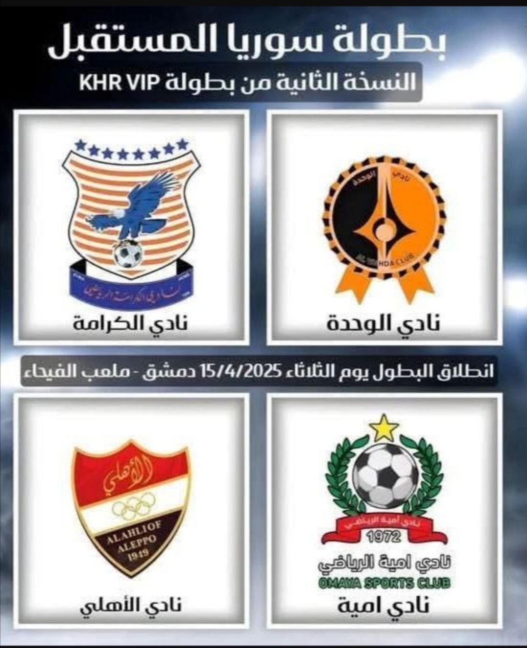 In support of the initiative to lift the ban on Syrian stadiums, the second edition of the “Future Syria” football championship will kick off tomorrow, Tuesday, with the participation of four local clubs including Al-Karamah, Al Ahli of Aleppo, Omaya, and Al-Wahda.