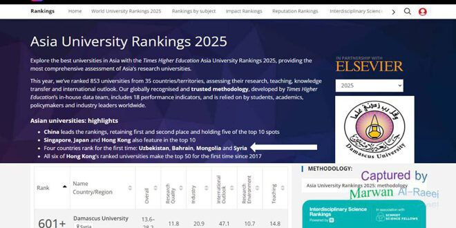 For the first time, Damascus University has been included in the UK Times Higher Education Asia Univesity ranking 2025, which makes it the first Syrian university to meet the scientific and educational requirements required for this internationally recognized ranking, which is considered the most important educational and research ranking for universities and research centers in Asia.