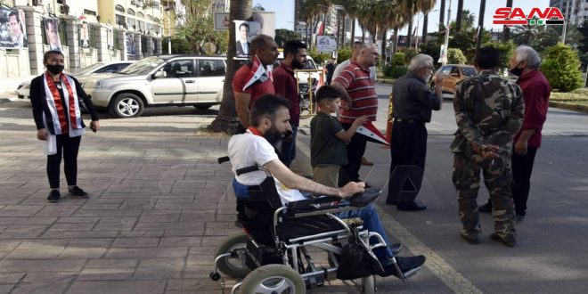 On his wheelchair pushed by his friend, wounded veteran Bassel Habib Ali arrives from the Qadmous area to the Thaer Al-Juhani Center in Tartous Governorate to vote in the presidential elections. He stressed that his participation today is an extension of the sacrifices he made on the battlefield in the face of terrorism throughout the Syrian territories.