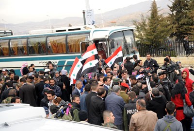 The returning families were welcomed at Yabus border center by the ministers of social affairs and labor and   Minister of State  for the Red Crescent affairs  and were escorted until their temporary accommodation center, Qudsaya  in Rural Damascus.