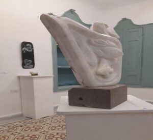 Sculptor Hadi Obeid participated in the exhibition with a marble work, which embodies a harp with fishes on it. He explained that “it is a surreal state. The harp is a musical state in harmony with life. The fish express marine music”.