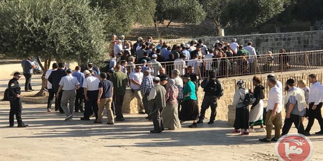 Occupied al-Quds, (ST) – Dozens of Israeli settlers renewed today storming of Al-Aqsa Mosque under the protection of the Israeli occupation forces.