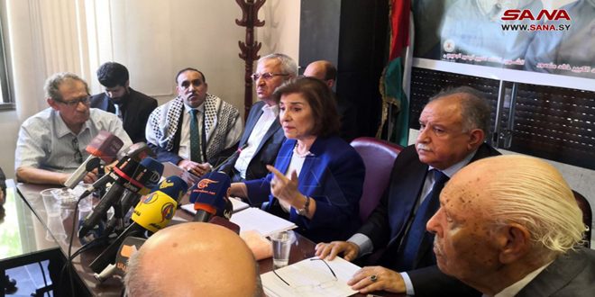 During a solidarity meeting with the Palestinian people at the headquarters of the Palestinian National Council in Damascus today, Dr. Shaaban indicated that the Israeli occupation is waging a war of extermination against the Palestinian people with the support of the United States, which provides protection for them from any accountability for their crimes. She noted that the countries that claim to defend human rights stand silent in front of the crimes of the occupation. This is considered a clear evidence that the plans of the West target us all as Arabs.