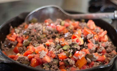 4- Add eggplant and tomato to ground beef. Cook until liquid is reduced.