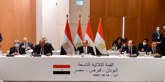 For his part, the Spokesman for the Egyptian presidency Bassam Radi declared that the ninth trilateral summit between Egypt, Greece, and Cyprus focused on developing cooperation at economic, political and cultural levels and the efforts of combating terrorism and extremist thinking.