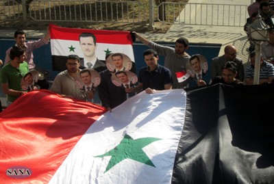 The demonstrators hoisted the Syrian Flag, President Al-Assad’s pictures, and raised pro-Syria banners. On some placards was written: ” hands off Syria”, ” Leave the democracy of rockets and bombs to yourselves”, and ”We all are with you Bashar in the frontlines confronting international terrorism”.