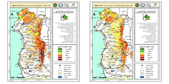 Damascus, (ST) – The Forestry and Fire Monitoring Platform of the General Authority for Remote Sensing (Fermo) warned of the continued impact of high levels of fire risk indicators on forest sites in northwest Syria until the end of this month.