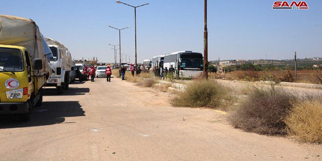 SANA said that ten buses carrying 407 terrorists along with their families moved towards northern Syria accompanied by cars affiliated to the Syrian Arab Red Crescent (SARC).
