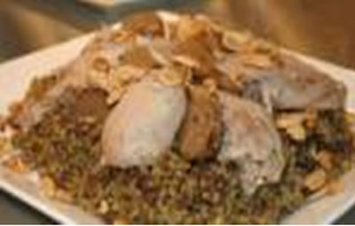 Dish the freekeh mixture (while still moist) onto a large serving plate. Place the chicken pieces on top, and then the truffles and nuts .