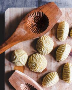 The dough, crafted from wheat flour and/or semolina, is pressed into special wooden molds, each intricately carved to create the iconic domed shape.Selecting the right type of mold engrave (Tabbeh)for each filling paste, eitherthe sweet date paste, crunchy walnuts, or rich pistachios is a delicate process. The fillings are infused with the fragrant essence of rosewater or orange blossom, adding a touch of floral sweetness.