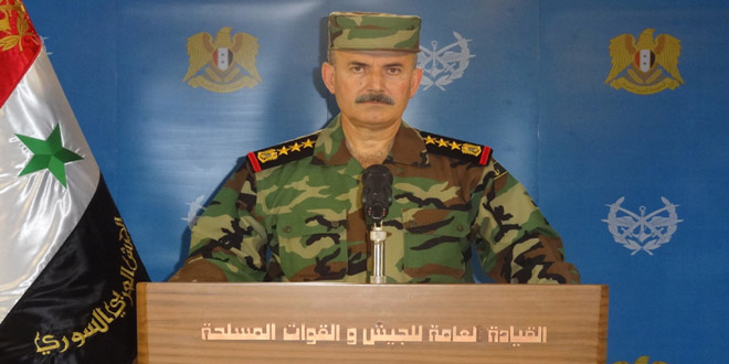 He went on to confirm that the Armed Forces thwarted repeated infiltration attempts by ISIS terrorists and destroyed three car bombs they had deployed before any of them reached military posts in al-Jafra in Deir Ezzor province, inflicting heavy losses in personnel and munitions upon the terrorists.