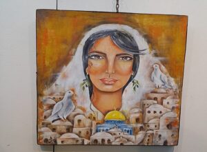 Participating artist Hanan MuhammadHanan Muhammad participated with two paintings using oil colors.. The first symbolizes the Palestinian woman who is the mother of the heroes, and the second is the lily flowers, which symbolizes the coming of spring, which means the coming of victory beside the white dove which is a symbol of peace .