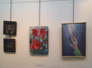 “I am displaying three paintings. The first depicts Palestinian heritage, Palestinian women.The second reflects old houses, and the third is a vase carrying roses which is a symbol of optimism.