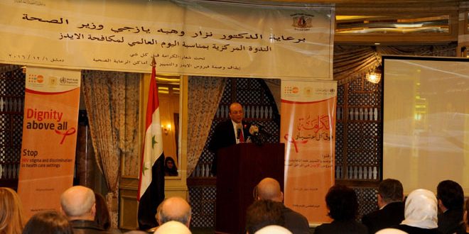Khlifawi was speaking at the central symposium entitled “Dignity above all – Stop HIV-related Stigma and Discrimination in healthcare facilities”, organized  by the Health Ministry, in cooperation with the World Health Organization (WHO), on the occasion of World anti- AIDS Day at al-Cham Hotel in Damascus, according to SANA.