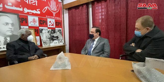 The Party’s Secretary Doraisamy Raja, during his meeting on Friday with Syria’s Ambassador to India Riad Abbas, hailed Syria’s firm stances and adherence to its principles represented in rejecting western dictates, respecting countries’ sovereignty and non-interfering in the internal affairs of other countries.