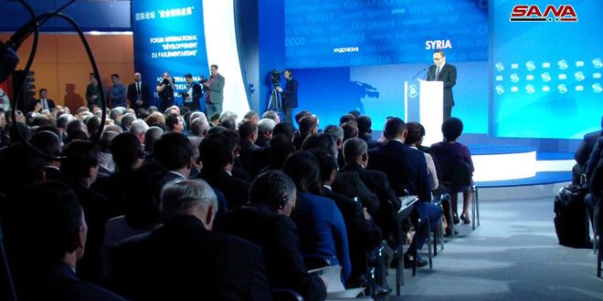 “Parliaments around the world play a major part in the improvement of national legislation and in the search for appropriate answers to modern challenges and threats. This explains the high demand for parliamentary diplomacy. It can strengthen trust among nations and positively influence the settlement of the most painful international and regional problems,” said Putin, according to SANA.