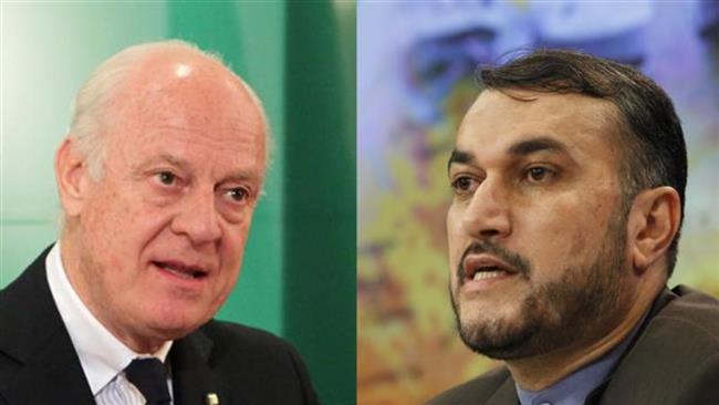 Iran’s Deputy Foreign Minister for Arab and African Affairs Hossein Amir-Abdollahian had a telephone conversation with UN Special Envoy for Syria, Staffan de Mistura, on Sunday to discuss the latest developments pertaining to international talks aimed at settling the crisis in Syria.