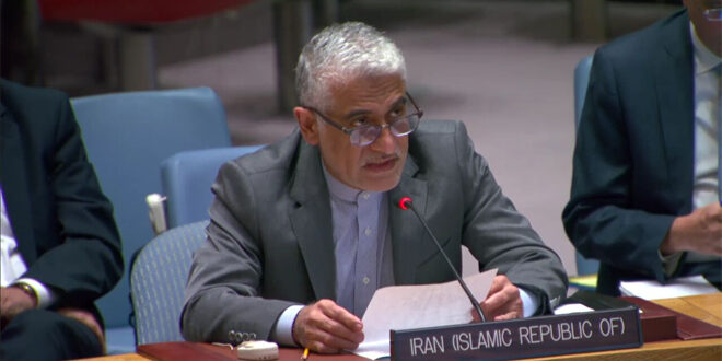 Iravani was quoted by IRNA News Agency as saying in a speech during the UN Security Council session on the situation in the Middle East and Syria: “the Israeli entity, in coordination with terrorist groups, pursues a systematic and targeted policy in its attacks trying to destroy the infrastructure in Syria.