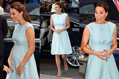 Kate Middleton isn’t just happy to be pregnant, she’s ecstatic! The Duchess of Cambridge stepped out for an evening engagement at the National Portrait Gallery in a pale blue Emilia Wick stead frock and matching heels, and practically glowed as she greeted the gathered crowds.
