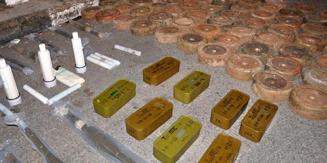 An official source at Sweida province told SANA reporter that after being precisely observed the two cars were stopped by authorities. Some 90 Israeli and US-made landmines as well as 25 RPG rounds and several ammunition boxes were confiscated.